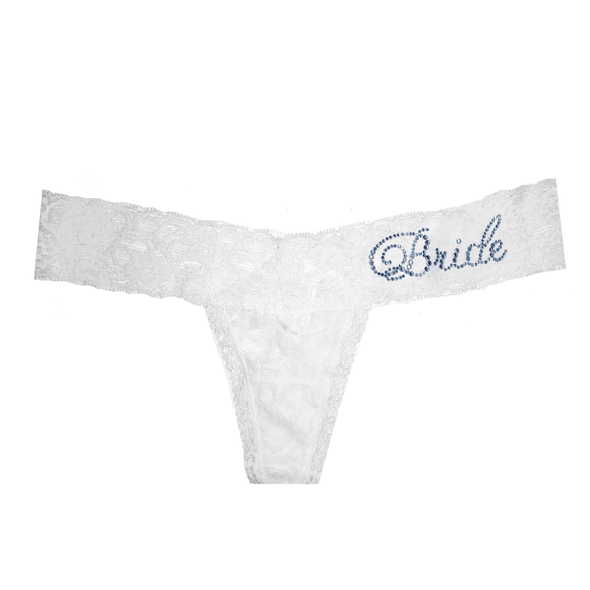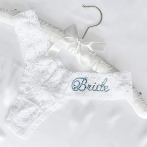 Classy Bride's Darling Lace Collection is the perfect addition to your wedding day assemble. Our Darling Lace Thong is a perfect fit and softly hugs your curves and lays flat leaving no unflattering lines. Available in one size to fit brides of all gorgeous shapes and sizes. The soft white lace thong comes with Bride spelled out in light pink, aquamarine blue, or clear crystals.